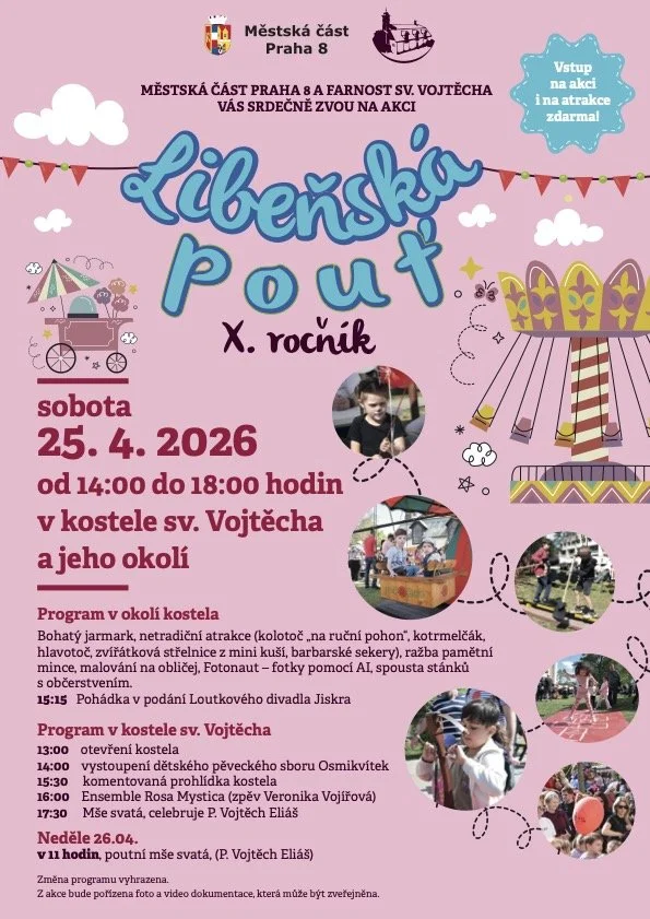 Libeňská pouť Saturday, April 25, 2026 2:00 PM 6:00 PM Kostel sv. Vojtěcha a jeho okolí U Meteoru Praha 8, Hlavní město Praha, 180 00 Czechia (map) Google Calendar ICS