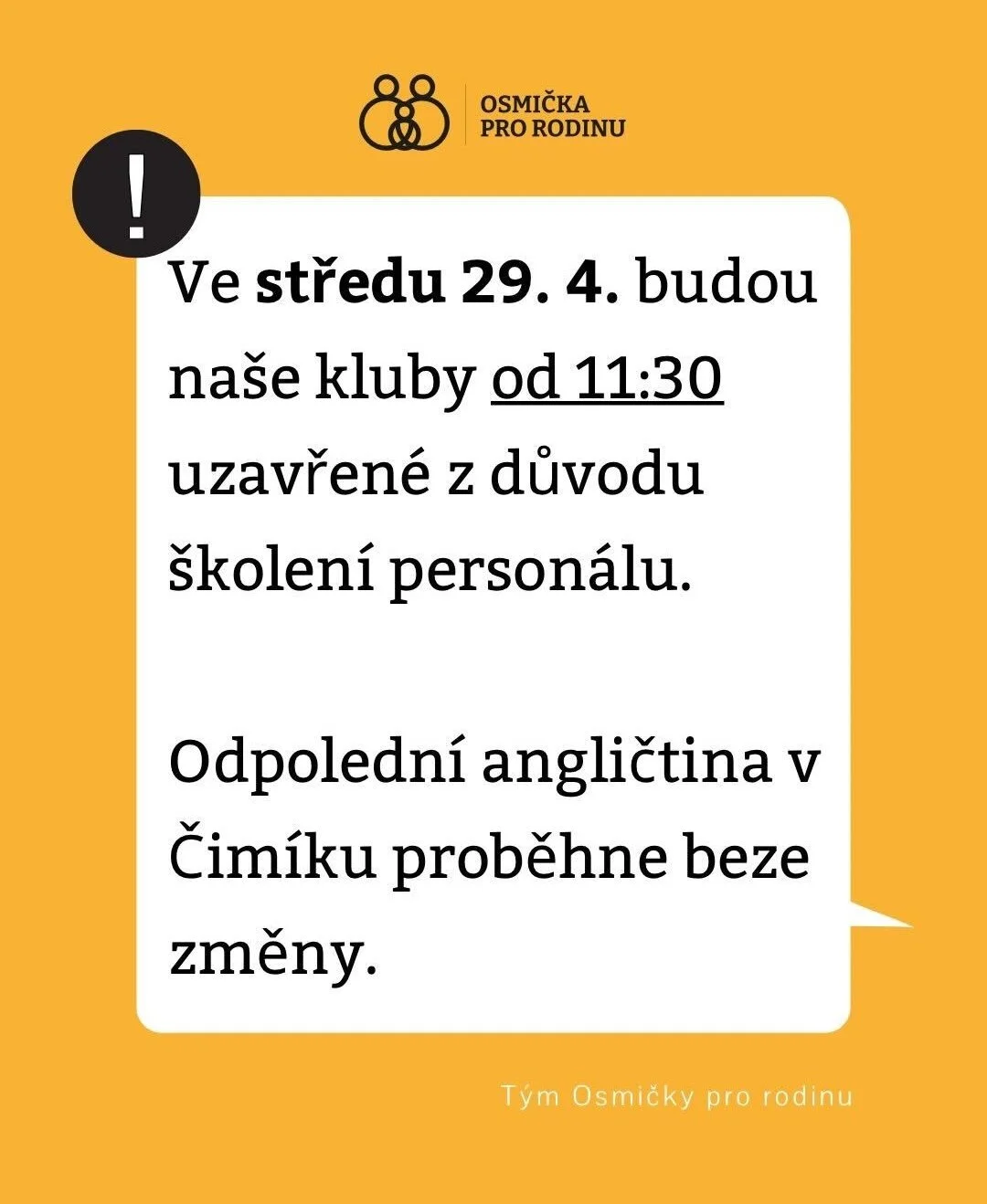RK zavřené od 11.30. Angličtina v Čimíku bude. Wednesday, April 29, 2026 11:30 AM 4:00 PM Všechny rodinné kluby (map) Google Calendar ICS
